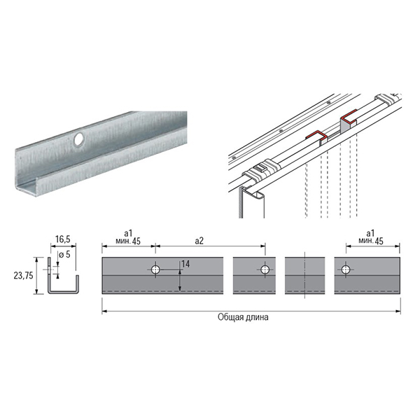 Концевой U-образный профиль двери 15-16мм, L2500, сталь