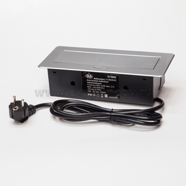Блок розеток выдвижной горизонт, 2 EURO, 2 USB, 250 В, 2700W сереб. 2 м