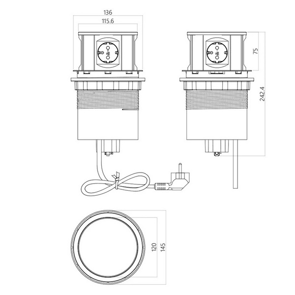 Блок розеток выдвижной вертикальный, 4 EURO, 250В, нержавеющая сталь, 2м
